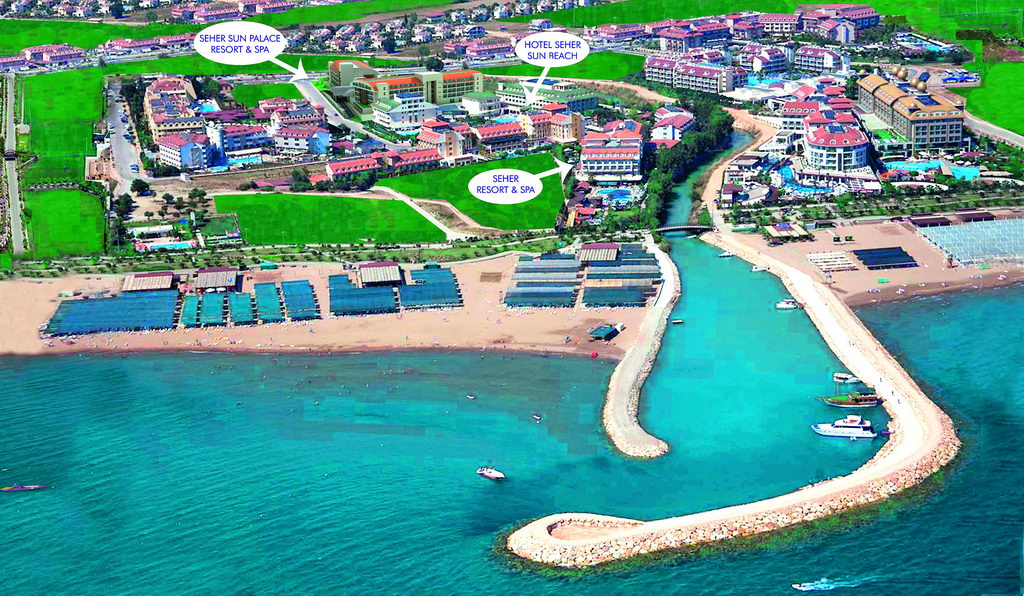 3 водные горки (c 01.05 по 31.10), ТВ салон бесплатно, игровой центр платно, теннисный корт бесплатно (с жестким покрытием, Seher Resort & Spa), прокат теннисных ракеток и мячей платно, освещение теннисного корта платно, дартс бесплатно, волейбол на пляже бесплатно, водные виды спорта платно, бочче бесплатно, баскетбол платно.- аквапарк или горки