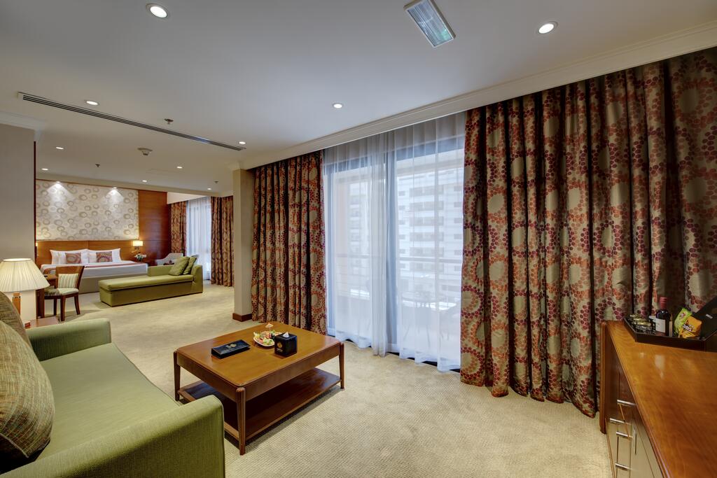Кондиционер, Wi-Fi (бесплатно), проводной интернет (платно), LCD-телевизор, кабельное/ спутниковое ТВ, письменный стол, электронный сейф, мини-бар, принадлежности для приготовления чая и кофе (бесплатно) утюг и гладильная доска (по запросу), ванная комната, фен. джакузи в Grand Suites, Уборка номера: ежедневно, room service: круглосуточно.- ванна/душ